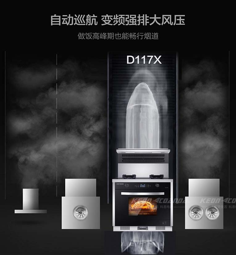 作為10余載高端廚電品牌,科恩電器一直引領著集成灶行業的發展,始終秉承著“為顧客提供更優質的廚電產品”。為時刻應對消費者需求,科恩電器不斷創新研發新品,積極布局集成灶產業,以“蒸烤消一體、變頻大吸力、模塊化、冰箱門、大容量三抽”五大核心的產品矩陣優勢引領廚電行業風潮!科恩智能變頻大吸力集成灶D117X作為新一代廚電產品,憑借擁有≥720Pa大風壓智能巡航系統,高達21m3/min爆吸技術,為用戶們有效解決了控煙、排煙問題,滿足不同的烹飪方式和開放式廚房的無煙生態環境而大受歡迎!