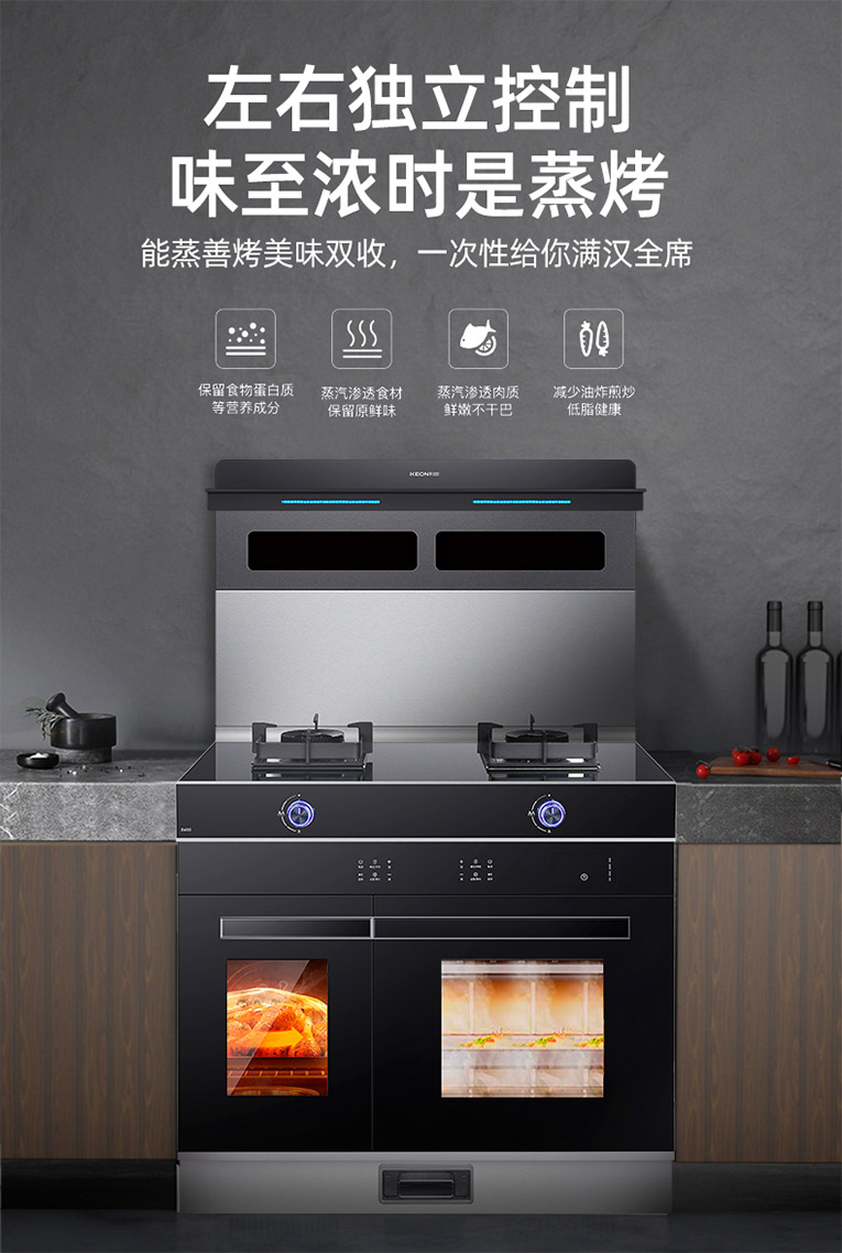 科恩S450左右蒸烤集成灶不僅將集成灶下置空間進(jìn)行了重新設(shè)計(jì),80L大容量整體拉伸內(nèi)膽設(shè)計(jì),30L烤箱容量加50L蒸箱容量,左烤右蒸,同時(shí)獨(dú)立操作,箱體不串味,烹飪更高效的同時(shí)還帶來(lái)了更好的烹飪體驗(yàn)。120℃高溫速蒸,急速加熱,快速出蒸汽,蒸汽底盤(pán)迅速產(chǎn)生和分配熱氣,包裹食材,快速鎖鮮,留住營(yíng)養(yǎng)與纖維;烤箱上下雙加熱系統(tǒng)立體交互,火力均勻外焦里嫩,360°立體燒烤功能,內(nèi)部熱量均勻分布,讓每層食物都保持高品質(zhì)烘焙效果,烤出驚艷好味道。