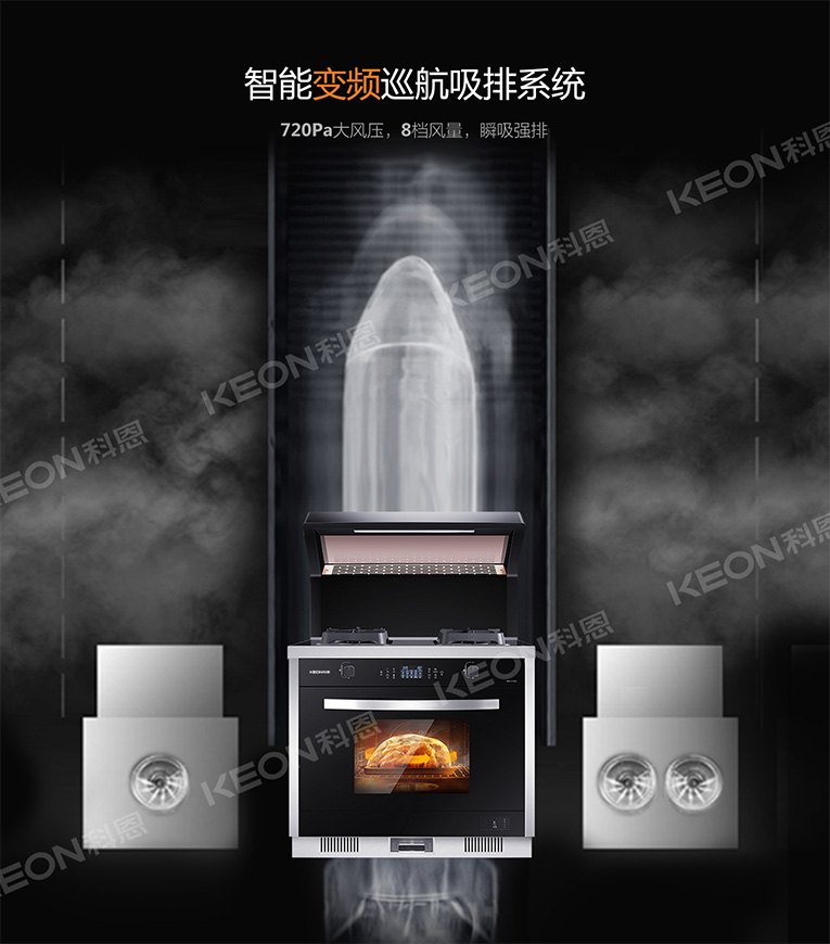 集成灶十大品牌、廚電行業十大品牌科恩集成灶采用變頻巡航增壓技術,擁有21m3/min爆吸,在源頭上防止油升騰擴散,強大的吸力將油煙完全排除,同時帶有煙機聯動功能,打開燃氣灶就能吸走油煙,讓油煙無處可逃,徹底吸排廚房油煙,讓女性不再忍受油煙困擾。