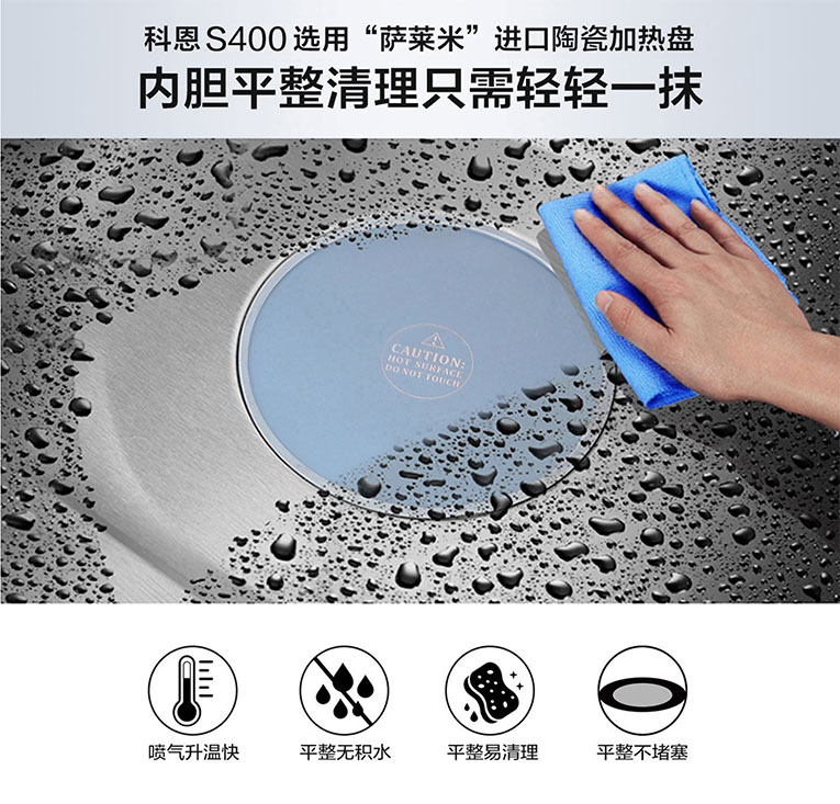 作為行業翹楚,集成灶十大品牌、廚電行業十大品牌科恩集成灶深耕行業數年,憑借對廚房痛點的敏銳度與洞察力,潛心鉆研新品及新技術,其中近期發布的科恩S400智能蒸烤消一體集成灶更是極大的滿足了市場的需求。在“蒸”方面,S400集成灶擁有了不起的“蒸”功夫,從物理角度講,100℃的水蒸氣比100℃的開水溫度更高。而130℃的水蒸氣比100℃的肯定具有更多的能量。想要蒸出可口美味的菜,蒸箱就需要滿足“溫度高、蒸汽足”的條件,傳統蒸箱最高溫度只能達到100℃,很難蒸出理想效果。集成灶十大品牌、廚電行業十大品牌科恩S400智能蒸烤消一體集成灶采用噴氣式4D立體蒸技術,底部陶瓷加熱盤加右側雙孔蒸汽噴射,蒸汽自外向內,將食物層層包裹,熱蒸合力,全方位滲透食材,短時間內食物即可快速熟透、酥糯。另外,S400集成灶還擁有頂部微晶玻璃體發熱,頂部不滴水,杜絕冷凝水,清潔更輕松。