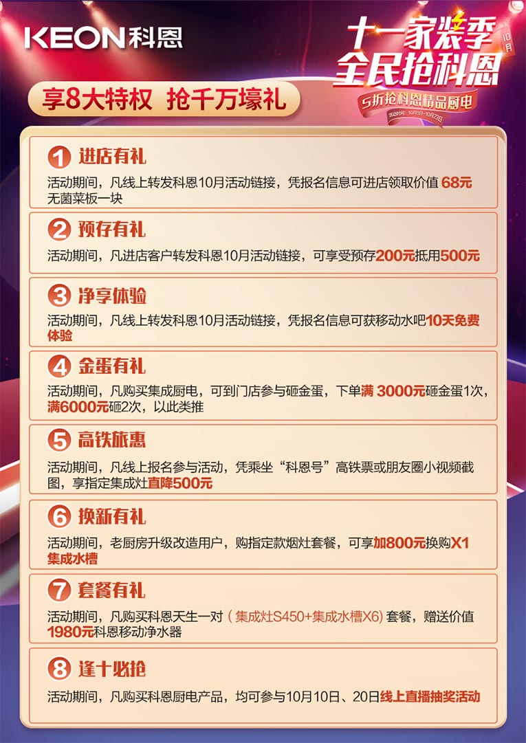 10月1日——10月23日,集成灶十大品牌、廚電行業(yè)十大品牌科恩集成灶“十一家裝季 全民搶科恩”活動開啟,終端活動玩法升級、福利加碼,打造金秋十月盛大福利狂歡盛宴,讓更多人能有機會享受到科恩集成灶十月活動帶來的福利。進店有禮、預存有禮、凈享體驗、金蛋有禮、高鐵旅惠、換新有禮、套餐有禮、逢十必搶豪禮巨獻。