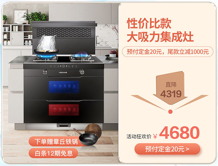 科恩集成灶雙11爆款搶免單,新一代變頻蒸烤消一體集成灶,八大烹飪模式蒸烤合一,集成灶選變頻,更省心!D151X變頻大吸力蒸烤消一體集成灶雙11狂歡價8760元,11月10日20點前5臺下單就有機會免單;
