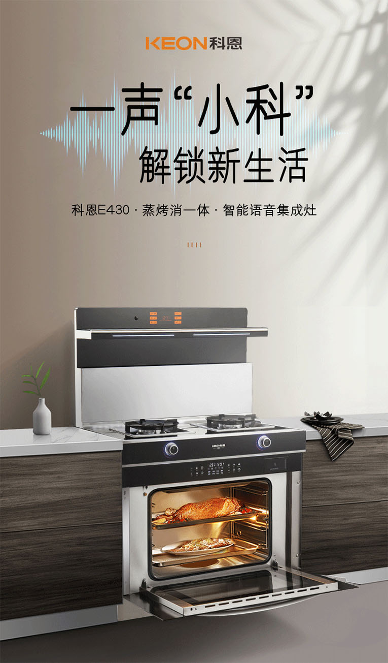 隨消費者對廚房油煙風險認識的提升,對于呼吸健康需求也得到了進一步的釋放,高效吸煙,隨心烹飪~科恩E430智能語音蒸烤消一體集成灶為消費者營造舒適烹飪環境,廚房油煙問題終將攻克,營造樂享智慧廚房新體驗!