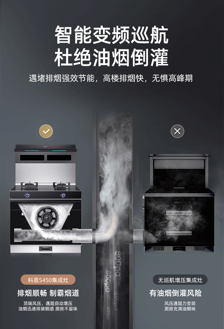 集成灶得以實現高效油煙吸凈率,則是源自對吸油煙方式的改變,將傳統上行排煙升級為側吸下排,集成灶十大品牌、廚電行業十大品牌科恩S450變頻大吸力左右蒸烤集成灶20m3/min澎湃大吸力,S級豪華轎車品質,低空封鎖油煙升騰區,清爽爆炒不過臉,吸凈雙灶爆炒煙,搭載智能變頻巡航系統,遇堵排煙強效節能,高樓排煙快,無懼高峰期。