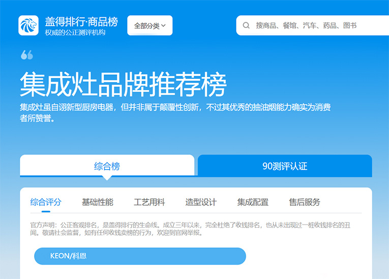 集成灶十大品牌、廚電行業(yè)十大品牌科恩集成灶憑借強(qiáng)大的品牌實(shí)力、優(yōu)質(zhì)的產(chǎn)品性能、領(lǐng)先色制造工藝在眾多的品牌中脫穎而出,榮登蓋得排行-集成灶品牌推薦榜,用實(shí)力印證了科恩品牌生而不凡。