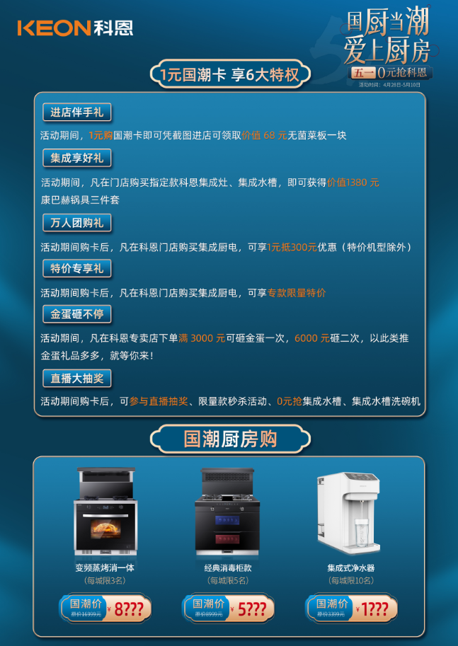 凡是購買1元國潮卡的用戶即可參與直播大抽獎活動:無菌菜板、PP棉濾芯、便攜榨汁杯、凈水龍頭、章丘鐵鍋、康巴赫鍋具三件套、集成水槽、集成水槽洗碗機...海量壕禮發不停!!!活動精彩紛呈,直播間也熱鬧非凡,全國各地的朋友們積極參與,用指尖傳遞著國廚當潮,愛上廚房的精致廚房新理念。