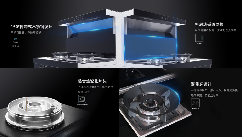 150°俯沖式不銹鋼設計,導流更輕松,排煙更順暢,科恩達磁吸網板,耐用易拆卸,清潔打理360°無死角,鋁合金磁化爐頭+一體拉伸聚能環設計,受熱更均勻,氧氣更充足,燃燒更充分。