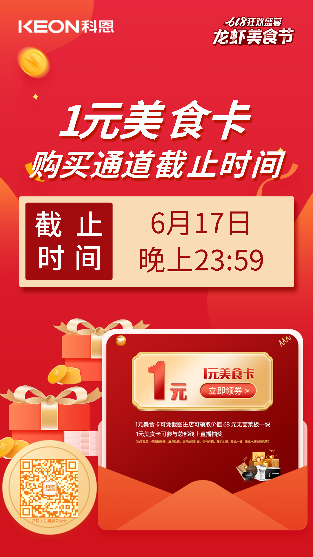 注意!注意!注意!科恩集成灶618狂歡盛宴——龍蝦美食節(jié)將于6月18日14點(diǎn)直播大抽獎(jiǎng)后落下帷幕,1元美食特權(quán)專屬卡權(quán)購買通道也將于今晚(6月17日)23:59準(zhǔn)時(shí)關(guān)閉!薅羊毛福利即將進(jìn)入倒計(jì)時(shí)!還沒有購買一元特權(quán)卡的朋友們要抓緊時(shí)間了!話不多說,最后一次薅羊毛安利,拿走不謝!