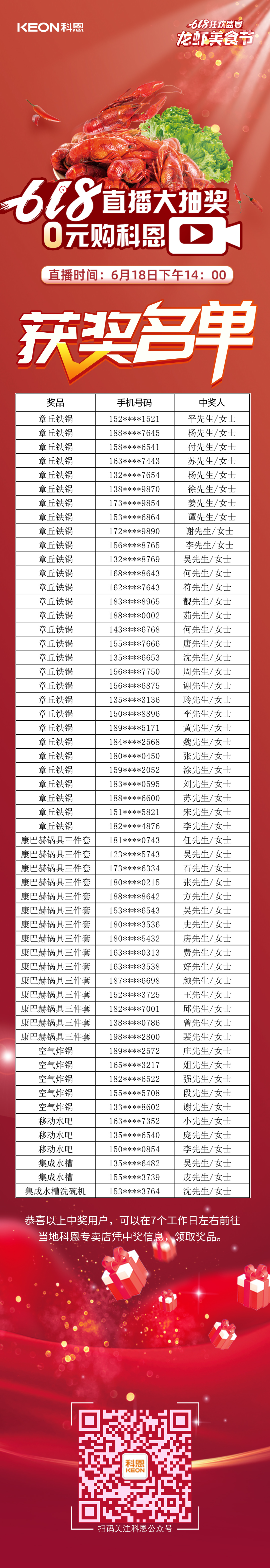 萬人品美食,0元搶科恩——科恩龍蝦美食節(jié)圓滿落幕,千城千店,共襄盛舉,感謝大家對科恩集成灶的大力支持,618直播大抽獎獲獎名單火熱出爐,恭喜以上獲獎的小伙伴們,請盡快聯(lián)系當(dāng)?shù)?a href="http://m.caasky.com/" target="_blank">科恩門店,快把獎品領(lǐng)回家吧!