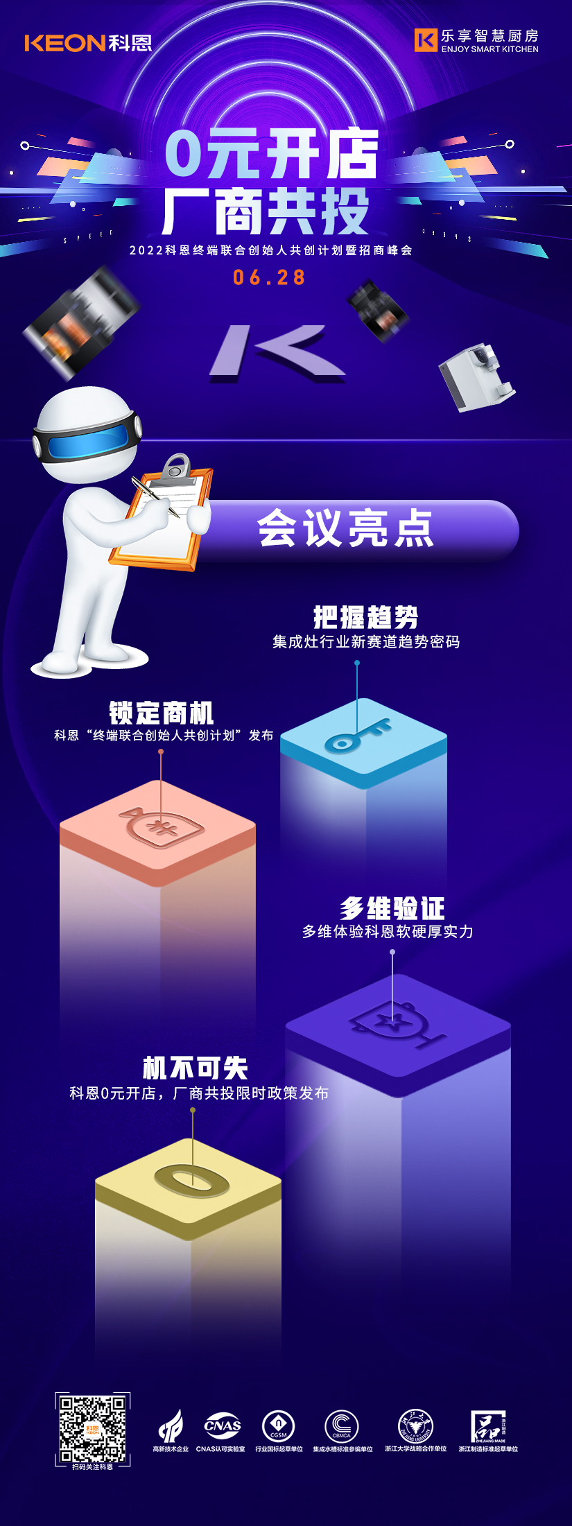 6月28日2022科恩終端聯(lián)合創(chuàng)始人共創(chuàng)計劃暨招商峰會將在廚具之都嵊州隆重舉辦,本次峰會將以“0元開店,廠商共投”為主題,邀請來自全國各地的行業(yè)精英、投資大佬匯聚一堂,共同探討廚電行業(yè)發(fā)展趨勢,解鎖集成灶行業(yè)新賽道趨勢密碼,多維驗證科恩集團軟硬厚實力,屆時,將為各位來賓解讀限時政策內容,為各位投資人提供一個潛力無限,共創(chuàng)霸業(yè)的優(yōu)秀共創(chuàng)平臺。