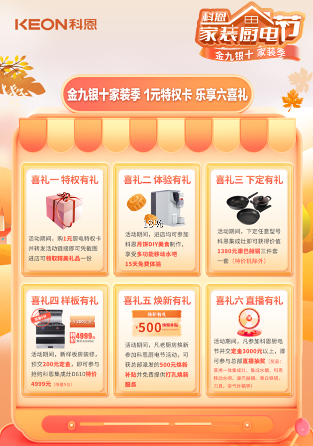 金九銀十科恩家裝廚電節(jié),1元特權(quán)卡,樂(lè)享六喜禮,還有超多精彩福利安排,這個(gè)假期等你來(lái)嗨!