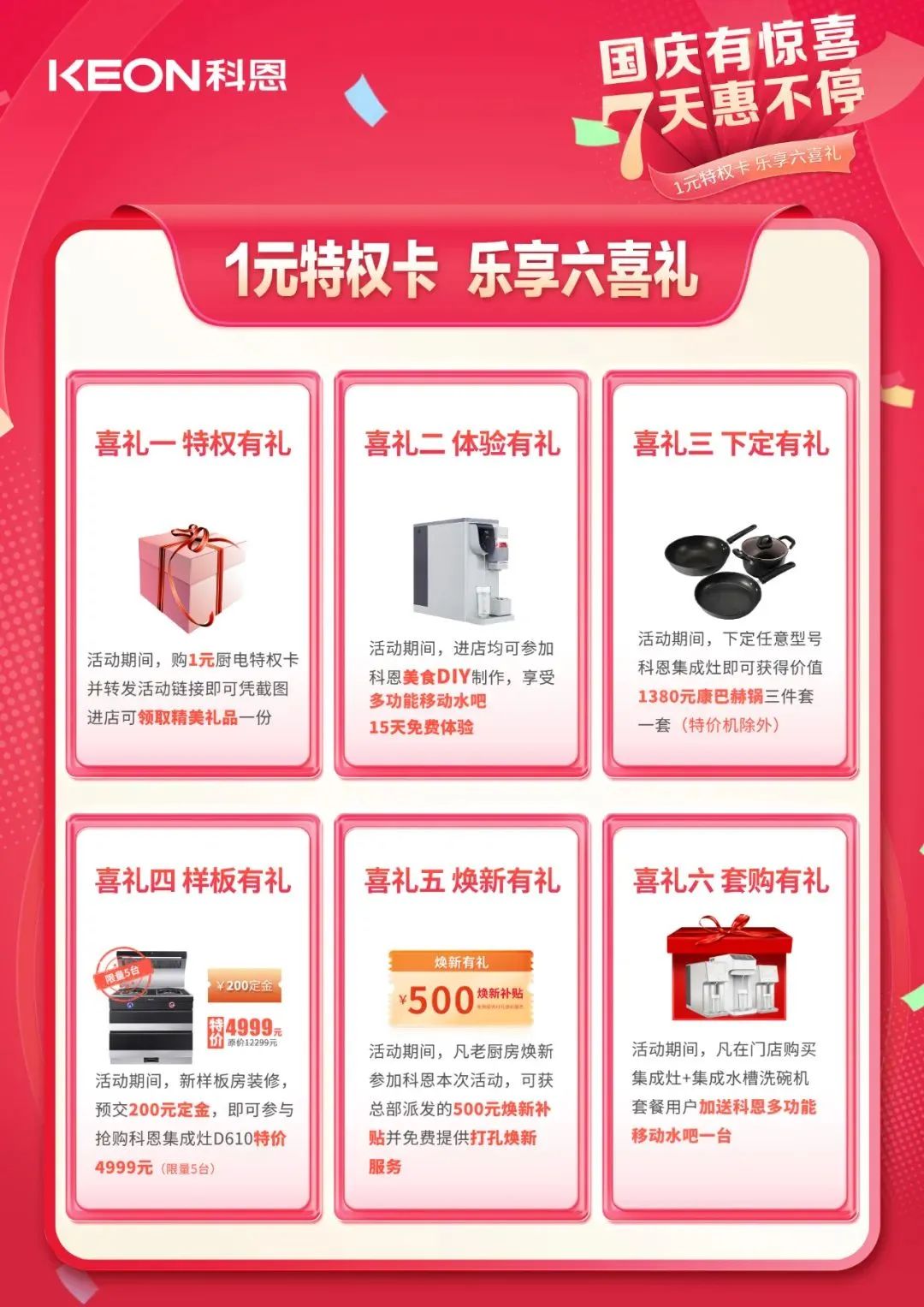 ✔ 1塊錢能干什么?在科恩集成灶,花1元即可享廚電特權(quán)卡權(quán)益,獲得驚喜禮品一份!同時(shí)還能享受科恩多功能移動(dòng)水吧15天免費(fèi)體驗(yàn)優(yōu)先使用權(quán)!