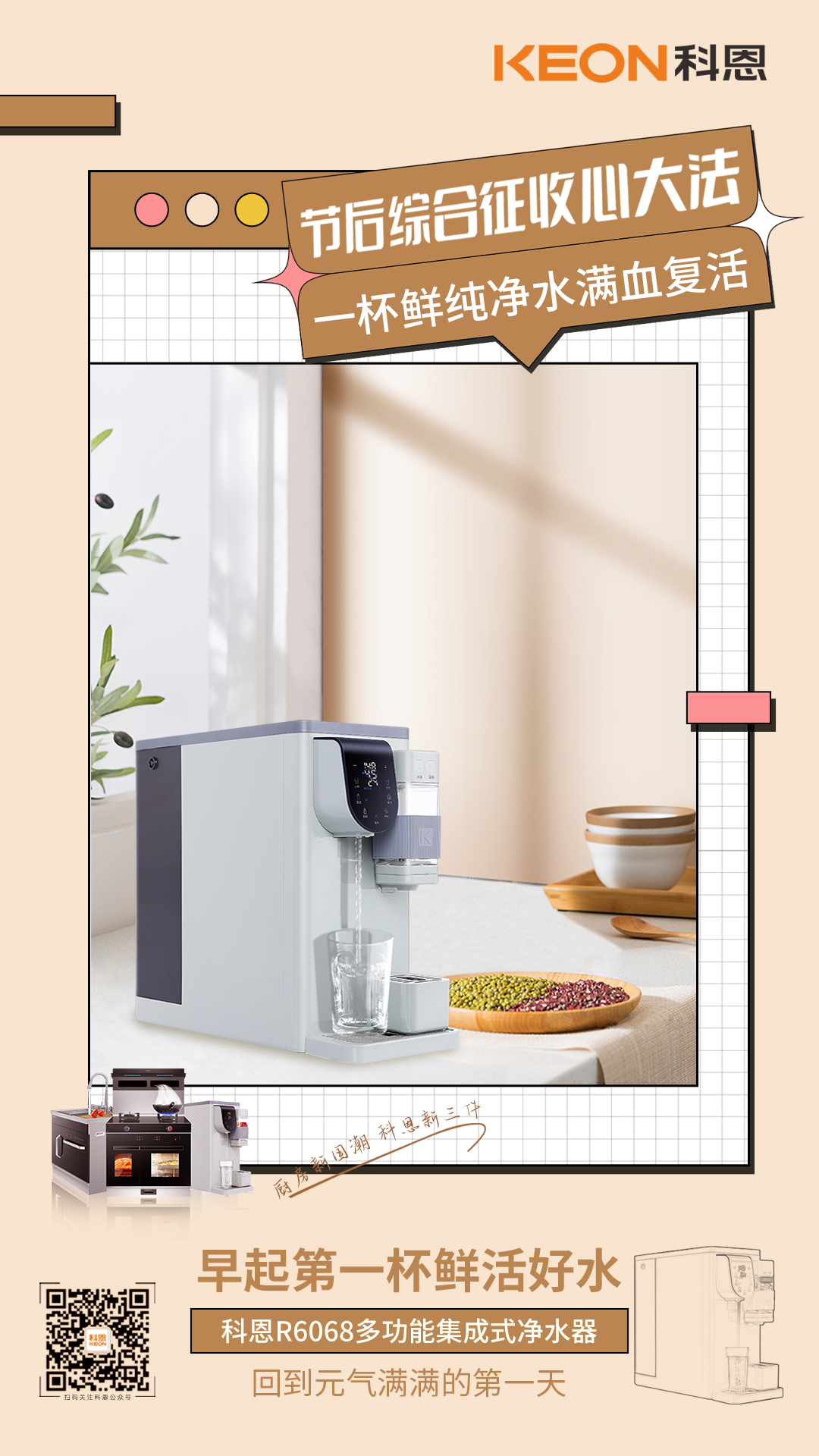 國(guó)慶長(zhǎng)假,熬夜晚起定時(shí)常態(tài),你需要一杯鮮活好水,煥新身體細(xì)胞,回到元?dú)鉂M(mǎn)滿(mǎn)的第一天!科恩R6068多功能集成式凈水器,一鍵適配不同飲水需求,溫度水量皆可調(diào)控,百變泡飲,滴滴鮮醇,RO精濾,UV殺菌,精濾至微,暢飲無(wú)憂(yōu),健康隨行!