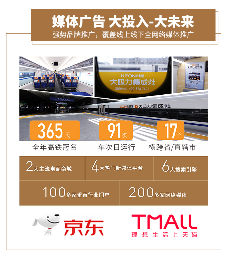科恩集成灶自2021年以來(lái)全力加速品牌推廣進(jìn)程,大手筆投放高鐵廣告,斥巨資全年冠名——“科恩號(hào)”高鐵品牌專列:橫跨17個(gè)省/直轄市,日運(yùn)行91車次,傳播面積之廣,受及群眾之多,在消費(fèi)者心目中有著極強(qiáng)的影響力和公信力,借助高鐵“國(guó)家名片”屬性為品牌權(quán)威背書(shū),讓“集成灶就選科恩大吸力”口號(hào)傳遍大江南北!如今,科恩電器再次重磅出擊,攜手嵊新高鐵站,強(qiáng)勢(shì)霸屏其黃金廣告C位,精準(zhǔn)覆蓋,持續(xù)品牌形象建設(shè),為品牌傳播助力加碼,實(shí)力詮釋“科恩速度”!