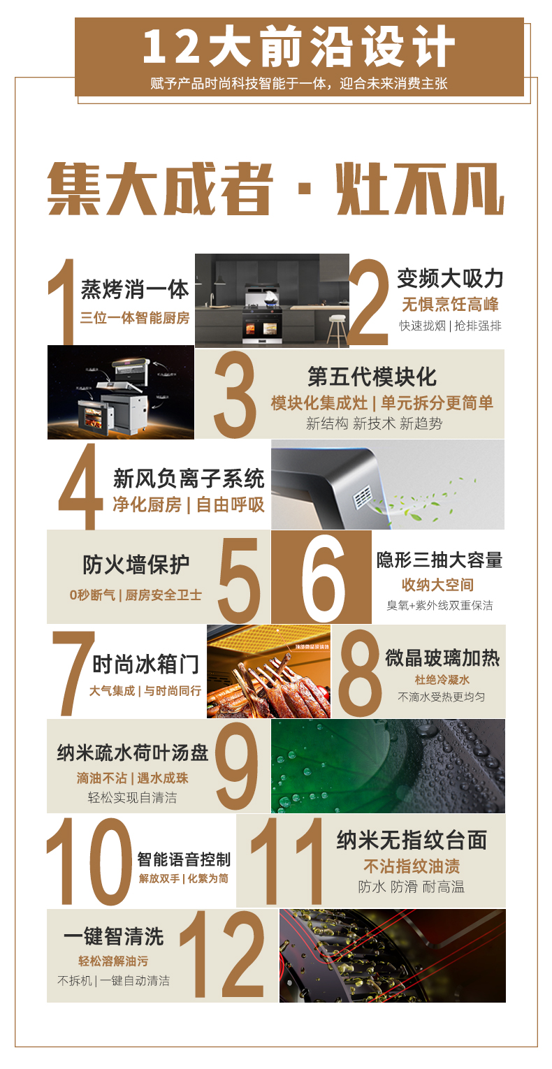 產(chǎn)品好不好,要看用戶的滿意度,科恩集成灶時(shí)刻洞察用戶需求變化,在產(chǎn)品研發(fā)上不斷發(fā)力,以變頻大吸力、第五代模塊化、智能語(yǔ)音互聯(lián)、蒸烤消一體、左右蒸烤、微晶玻璃加熱、納米疏水荷葉湯盤、納米無(wú)指紋臺(tái)面、一鍵智清洗等12大差異化前沿技術(shù),實(shí)現(xiàn)多項(xiàng)性能提升突破,為用戶帶去“樂(lè)享智慧烹飪”廚房新體驗(yàn)。