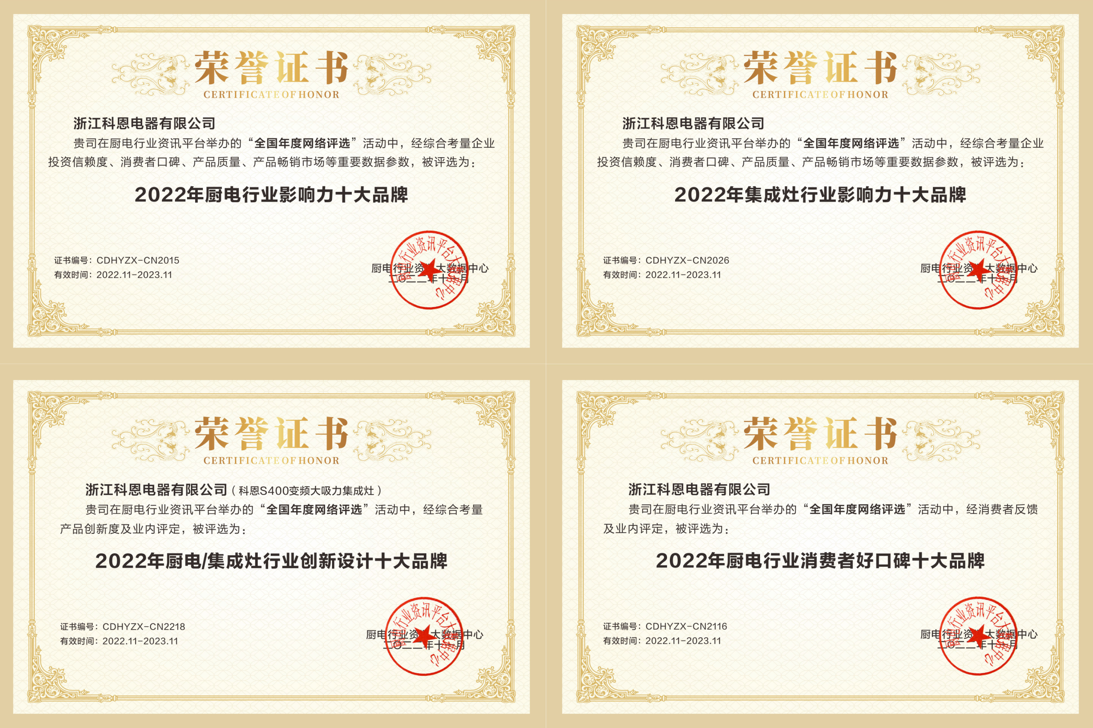 自2022年廚電/集成灶品牌推薦活動啟動以來,經過企業篩選、資格初審、后臺評論、留言推薦、數據核對、綜合評審等階段??贫麟娖鲬{借強大的綜合實力和品牌影響力在廚電行業資訊平臺評選中脫穎而出,斬獲“十大品牌”四大殊榮!