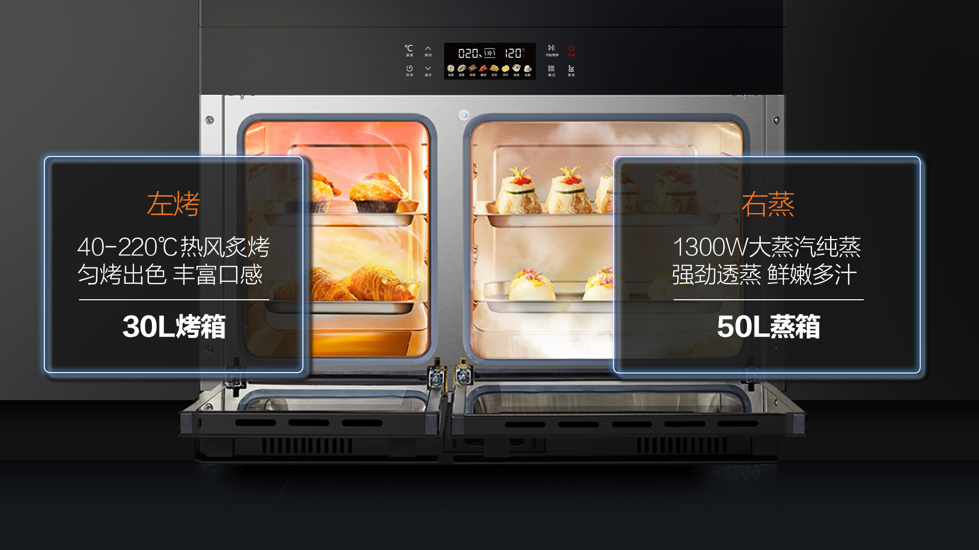 同時A3系列左烤右蒸款,可一次烹飪10道菜肴,真正實現倍速烹飪。蒸箱采用3D澎湃蒸,1300W大蒸汽純蒸,食物更鮮美;烤箱采用立體勻烤,頂部環形加熱管+循環風機+底部隱形加熱管,烤的更美味,且具有無油空氣炸功能,讓炸更健康,輕松解決小朋友愛吃薯條又不健康的難題。