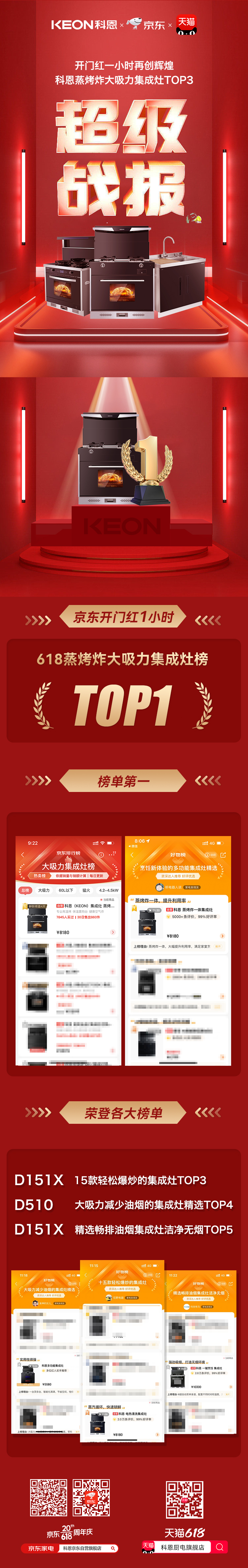 53120:00618開門紅正式開啟。在這場各大品牌的“首波交鋒”中,科恩集成灶表現尤為亮眼。截至53121:00科恩集成灶斬獲京東蒸烤炸大吸力集成灶TOP1蟬聯第一!