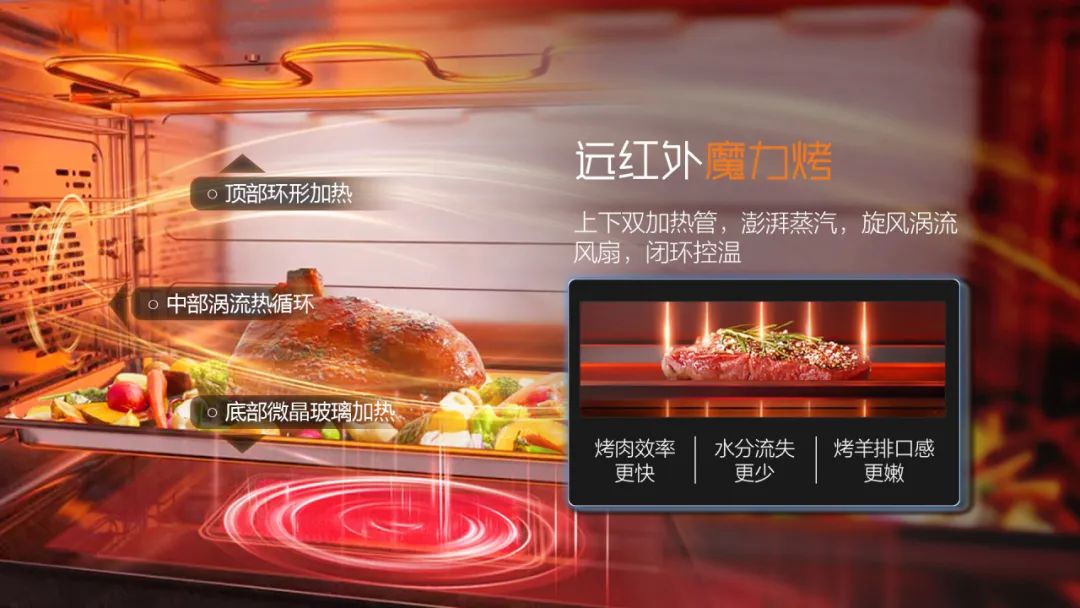 遠紅外魔力烤采用上下雙加熱管,澎湃蒸汽,旋風渦流風扇,閉環控溫。