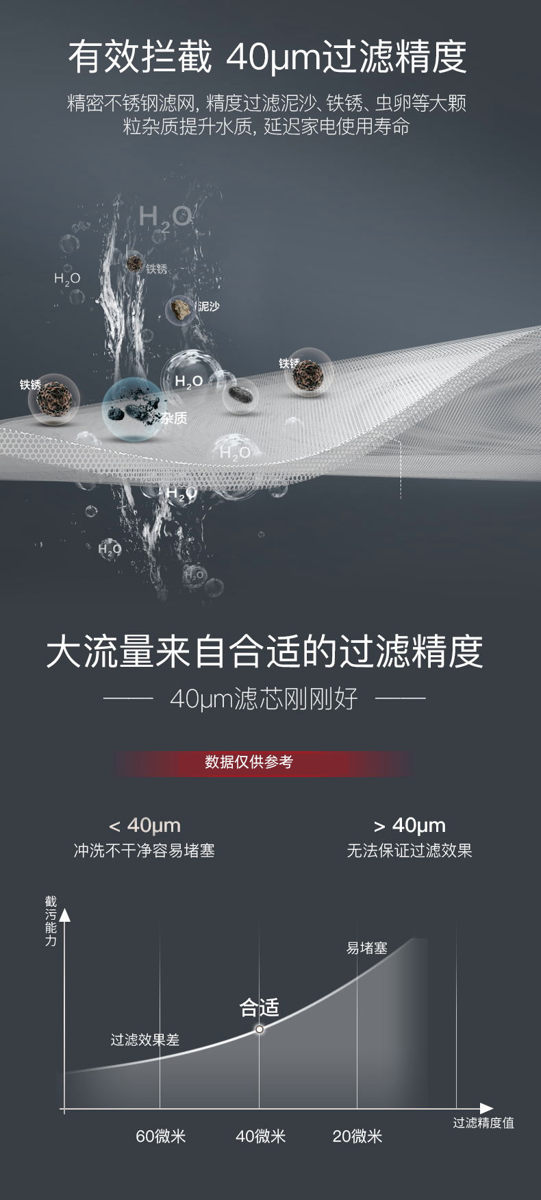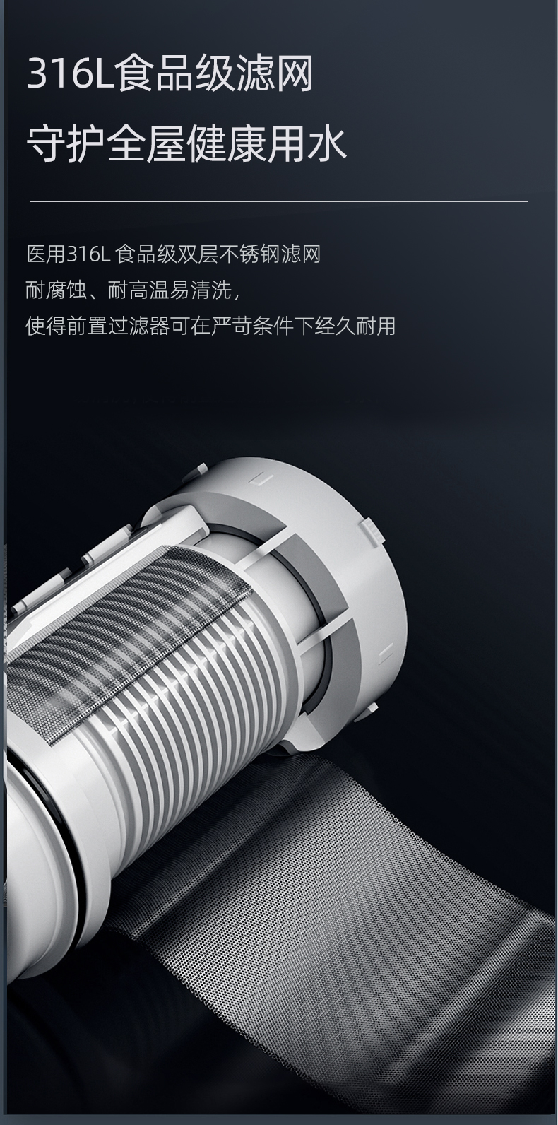 同時,Q30采用40um過濾精度,精密不銹鋼濾網,精度過濾泥沙、鐵銹、蟲卵等大顆粒雜質,提升水質,延長家電使用壽命,完美解決新小區(qū)洗衣機進砂石的煩惱。