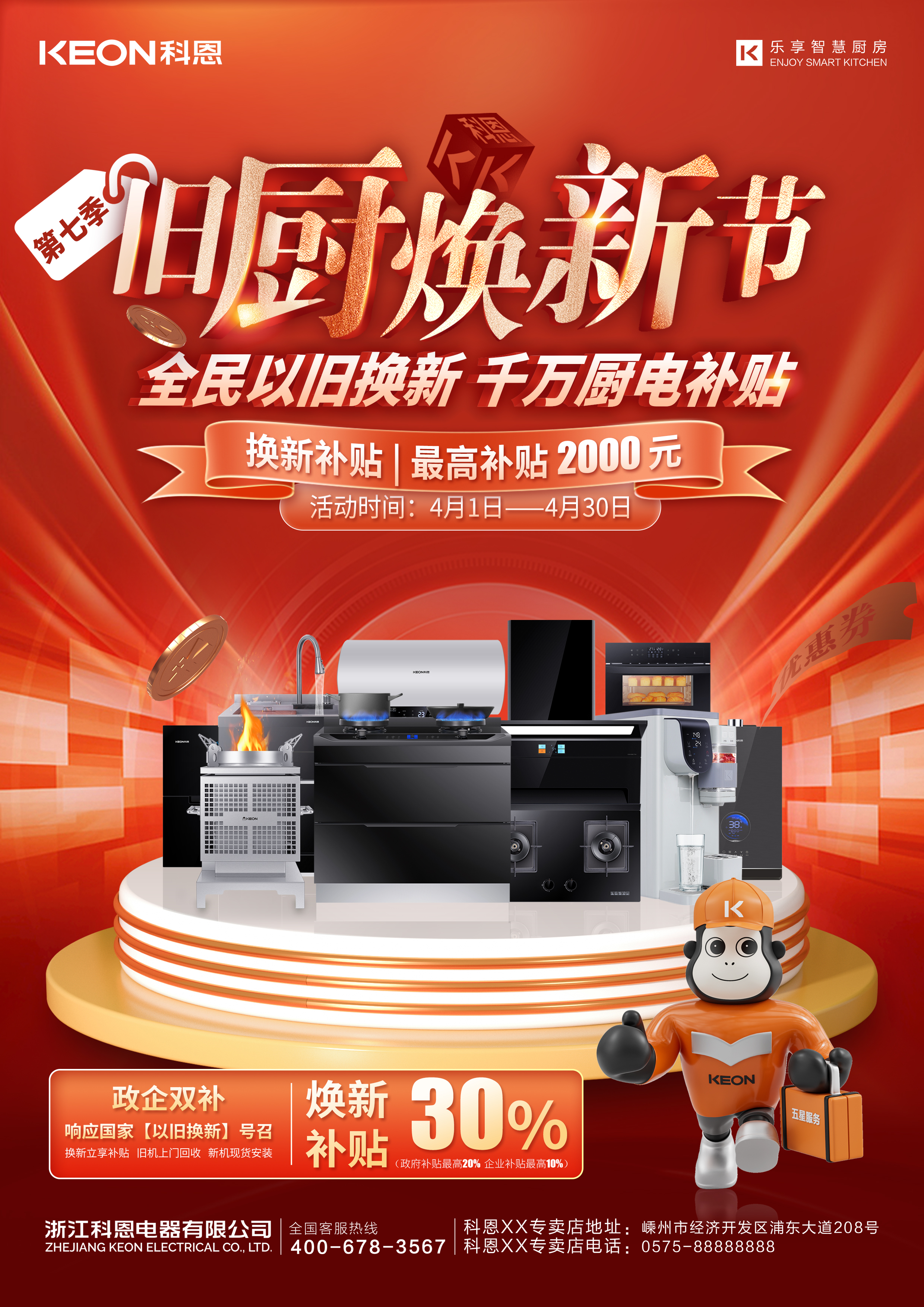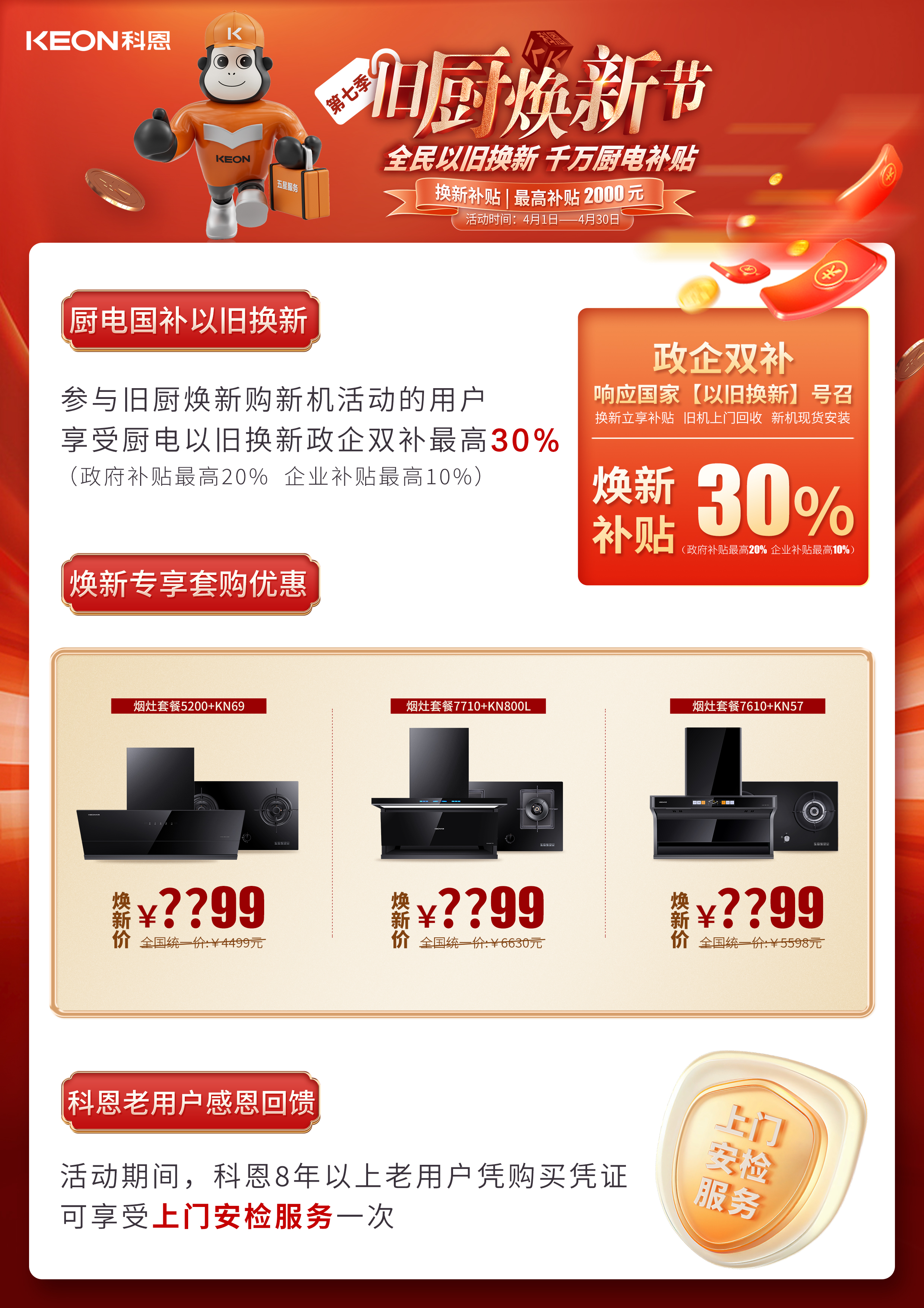 春意漸濃,煙火煥新。科恩電器四月“舊廚煥新節(jié)”全面啟動(dòng)!政府補(bǔ)貼疊加企業(yè)補(bǔ)貼,雙重福利最高直抵廚電總價(jià)30%,最高可達(dá)2000元,更有煥新專(zhuān)享套購(gòu)優(yōu)惠,感恩回饋等福利,讓智能廚房一步到位。