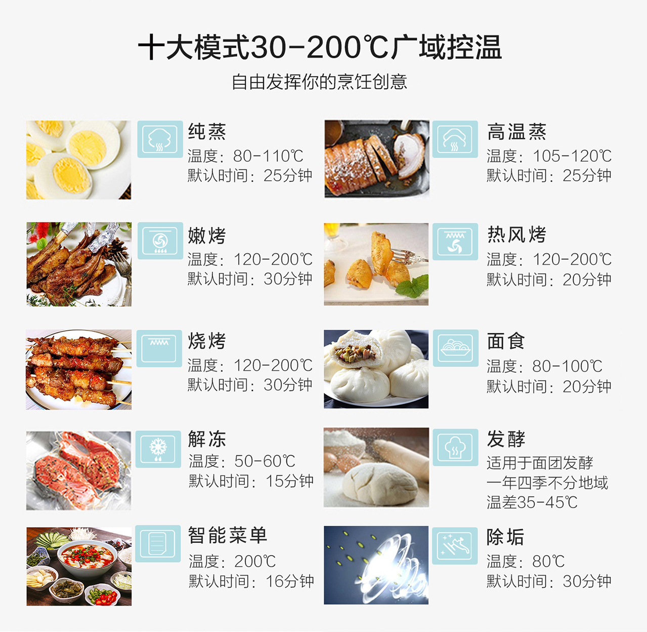 62L大容量食品級304不銹鋼內膽,上下4層設計,9種蒸烤模式。