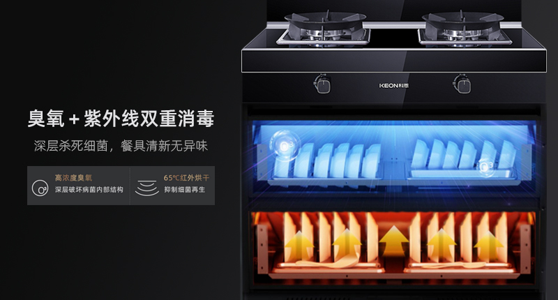 大容量雙層消毒柜,鍋碗瓢盆輕松盡收,臭氧+紫外線雙重消毒,深層殺死細菌