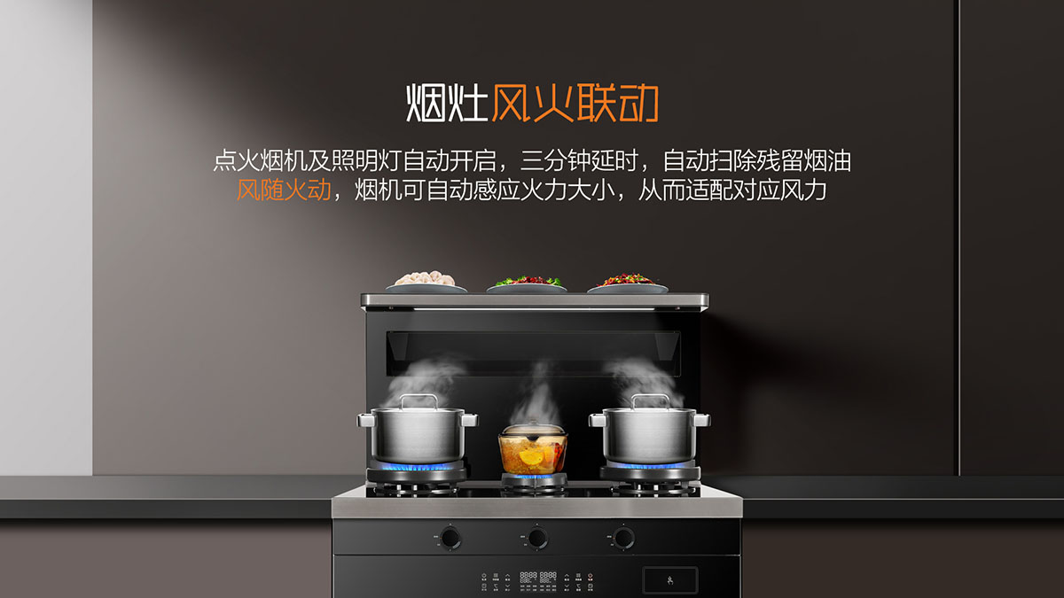- 煙灶風(fēng)火聯(lián)動,點火煙機及照明燈自動開啟,風(fēng)量隨火力大小自動調(diào)節(jié)